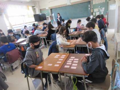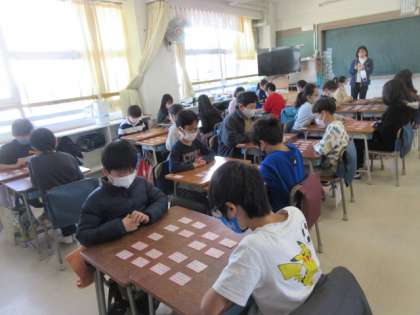 2人組になって百人一首をしています。教室では物音がしないくらい子どもたちは集中しています。