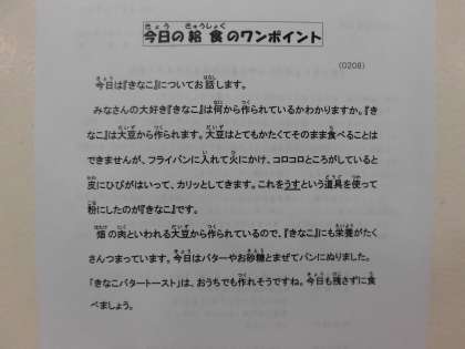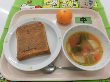 【献立】きなこバタートースト・ミネストローネ・みかん・牛乳
