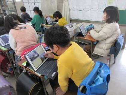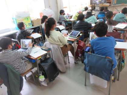 昔と今の世田谷のちがいについて、タブレットで2枚の写真を比べたり、1名の写真を引き伸ばしたりして、気が付いたことを発表し合っていました。