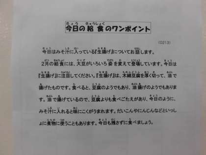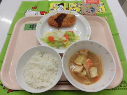【献立】ごはん・魚のフライ・野菜の甘酢かけ・生揚げのみそ汁・牛乳
