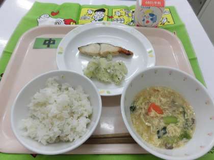 【献立】麦ごはん・魚の西京焼き・粉吹き芋・きのこ入りかきたま汁・牛乳