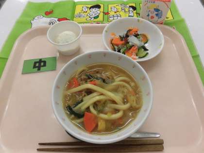 【献立】カレーうどん・わかめとしらすの酢の物・おからのスノーボール・牛乳