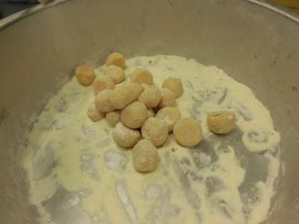 バター、おから、小麦粉、砂糖、スキムミルクを混ぜて生地を作り、これを丸く丸めて焼きます。焼きあがったら粗熱を取り、スキムミルクと粉砂糖を混ぜたものをからめます。これをカップにいれます。さらにスキムミルクと砂糖を混ぜたものをかけてスノーボールになるためのお化粧をして出来上がりです。