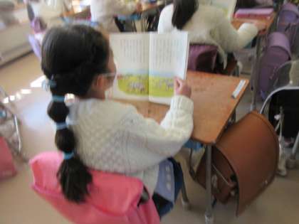 説明文の学習。1文ずつ順番に音読をしています。日頃の音読の成果が出ています。