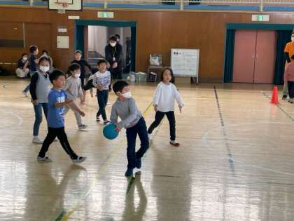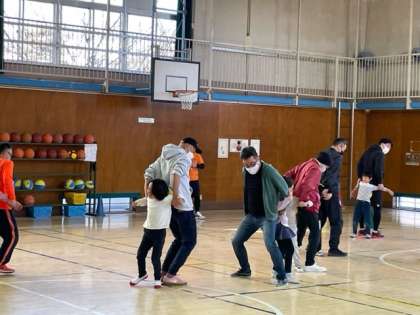 かっパの会、久しぶりのイベントは親子ドッジボール大会。準備運動の後は、子ども対大人の対戦です。元気な声が体育館に響きました。写真は1年生の様子です。
