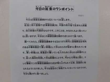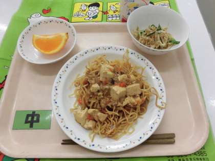 【献立】ごはん・麻婆豆腐焼きそば・もやしのごま風味・不知火・牛乳