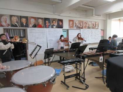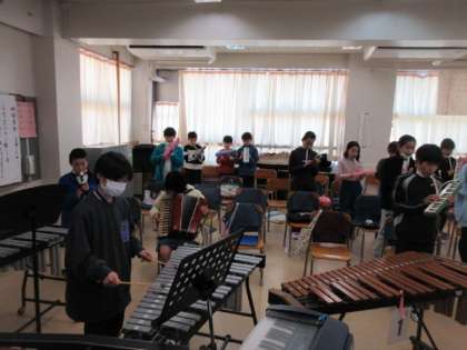 子どもが指揮をして、「ドラクエのマーチ」の合奏の練習が盛り上がっていました。