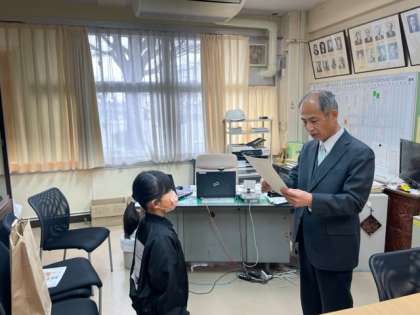 今日の校長先生のお話は、12年前に起きた東日本大震災を忘れないようにしようという内容でした。今日の表彰、まずは書写でよい作品を書いた児童でした。
