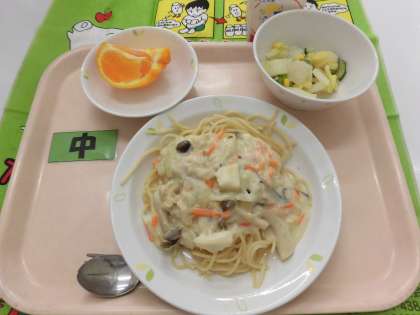 【献立】スパゲティーきのこソース・白菜とコーンのサラダ・デコポン・牛乳