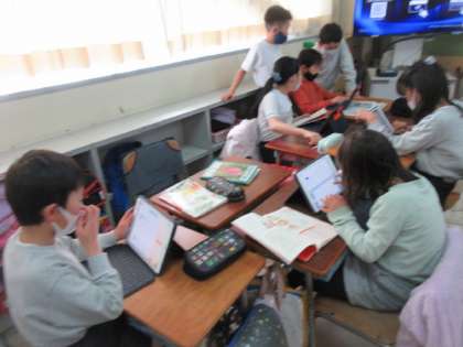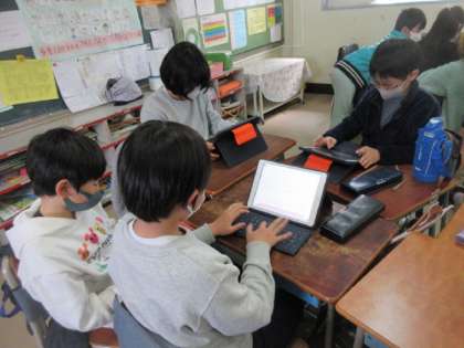 自分たちの生活について調べ、考察し、発表する学習です。タブレットのアンケート機能を活用して、アンケートを作ったり、アンケートに答えたりしていました。