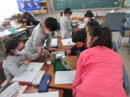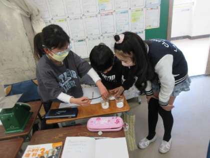 塩と砂糖はどちらが重いのかの実験。これを解決するためには体積をそろえるということに気付いていました。