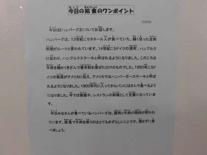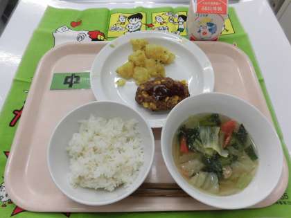 【献立】麦ごはん・ハンバーグ・粉吹き芋・野菜スープ・牛乳