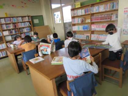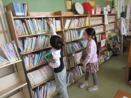 友達に読み聞かせをするために、図書室で本を探したり、読んだりしています。