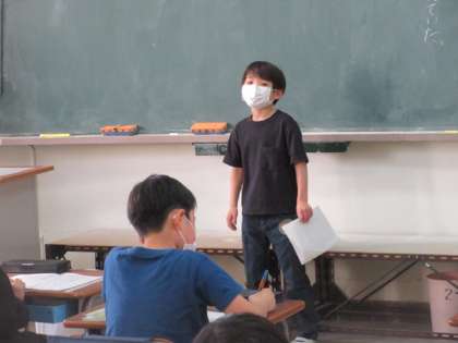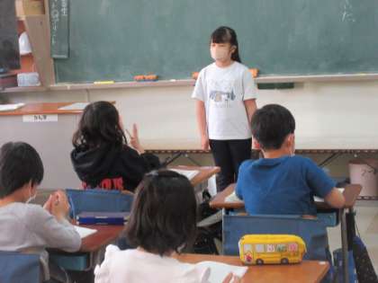 心に残る出来事を選んで、振り返りを自分の言葉で発表していました。聞いている子どもたちは発表の感想をノートに書いていました。あたかかな雰囲気でした。