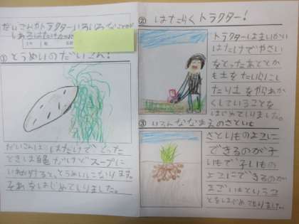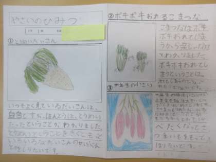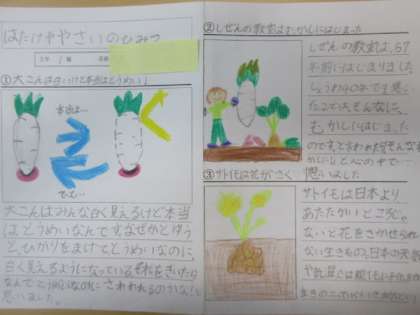 2年生が野菜や畑の整備、自然の教室の歴史などについてまとめた学習シートを校長室に届けてくれました。その子なりの思いが感じられ、これからも収穫体験や農園を大切にしていってほしいです。