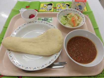 【献立】ナン・キーマカレー・キャベツサラダ・いちご・牛乳