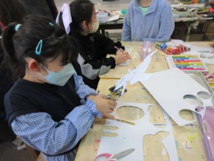 穴をあけ、はとめでつないで、楽しく動くおもちゃ作りをしています。