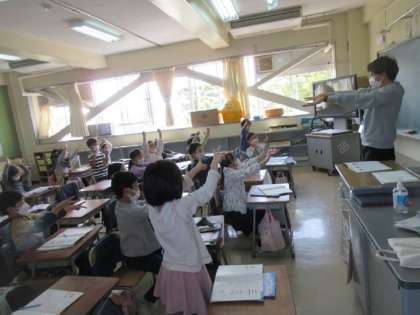 1年生が担任の先生と楽しくじゃんけんをしています。