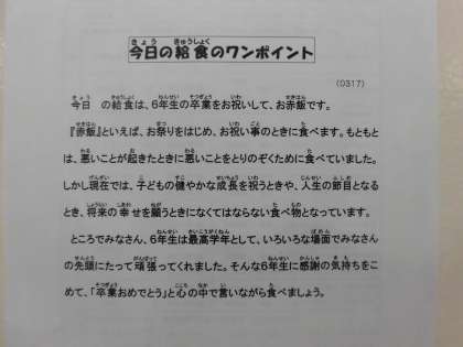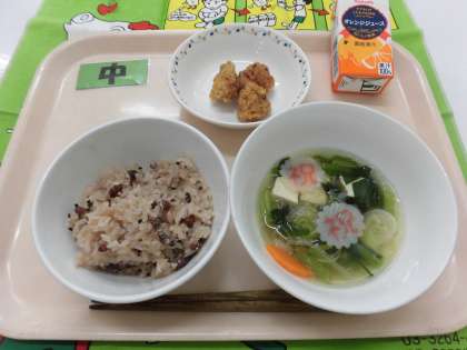【献立】赤飯・とりのから揚げ・お祝いすまし汁・みかんジュース