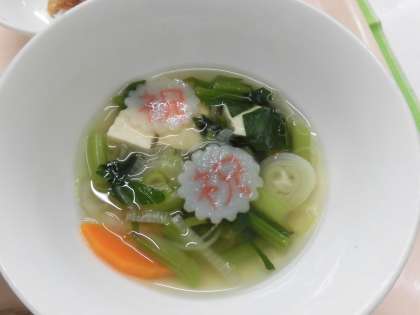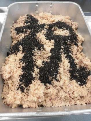 6年生の赤飯には、黒ごまで「祝」の字を描きました。すまし汁には「祝いなると」が入っています。