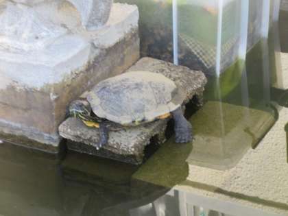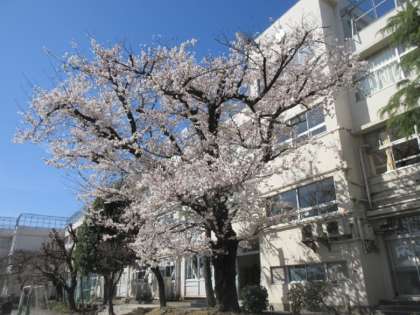 校庭の1本の桜が満開に花を咲かせています。かめのヒナタが水から出てきてのんびりと休んでいます。