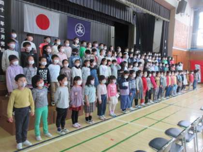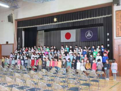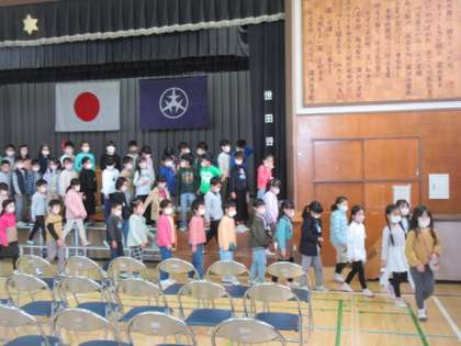 1時間目に1年生が入学式で披露する出し物の練習をしています。