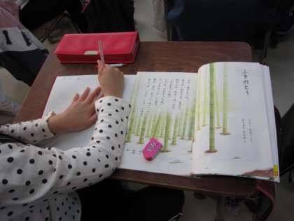 教科書開いて。ノート開いて。しっかり黒板を見ながら書いてます。