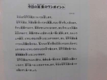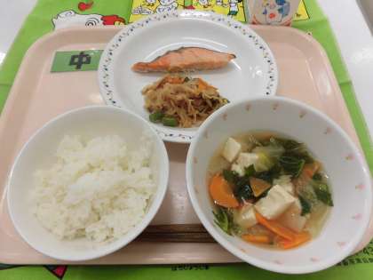 【献立】ごはん・鮭の塩焼き・切干大根の煮つけ・菜花のすまし汁・牛乳