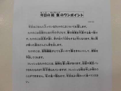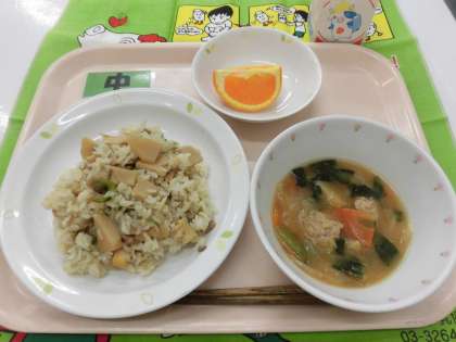 【献立】たけのこごはん・肉団子入りみそ汁・清見オレンジ・牛乳