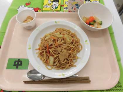 【献立】ソース焼きそば・コロコロ野菜・きなこ団子・牛乳