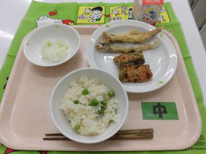 【献立】グリンピースごはん・天ぷら(ししゃも)・ちくわの磯辺揚げ
