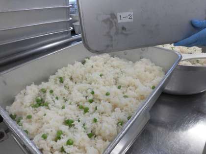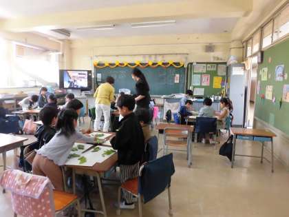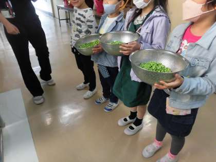 子どもたちがグリンピースのさやを一生懸命にむいて、給食室に届けました。
