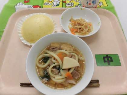 【献立】煮込みうどん・はりはり漬け・りんご入り蒸しパン・牛乳