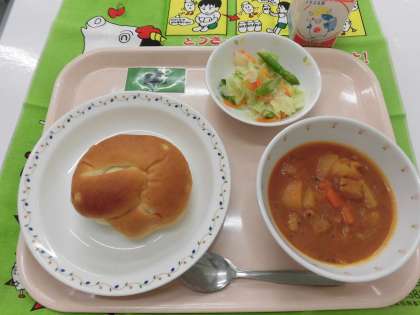 【献立】パインパン・トマトシチュー・キャベツとアスパラのサラダ・牛乳