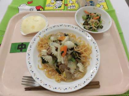【献立】あんかけ焼きそば・塩ナムル・米粉の黄桃蒸しパン・牛乳