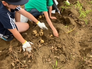 今日のじゃがいも掘りは、4年生の番です。夢中になって掘っています。大きなじゃがいもがゴロゴロ出てきます。