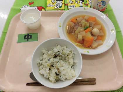 【献立】青菜じゃこのごはん・豚肉と大根のうま煮・ホワイトゼリー・牛乳