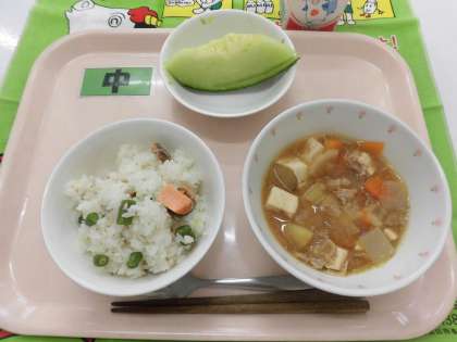 【献立】鮭ごはん・豚汁・タカミメロン・牛乳
