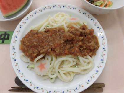 うどんの上に肉みそをかけ、星形のなるとをそえますが、肉みそを天の川に見立てて、星形なるとを肉みそを境に両端によそいました。少しは七夕の雰囲気が出たでしょうか。