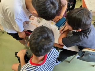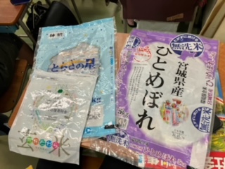 社会で、お米の産地の学習。家から持ち寄ったお米の袋から、いろんな事を発見していました。