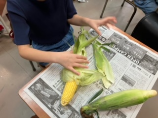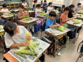 今日の給食で使うとうもろこしの皮剥きを、3年生のみんなが体験しています。