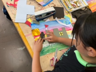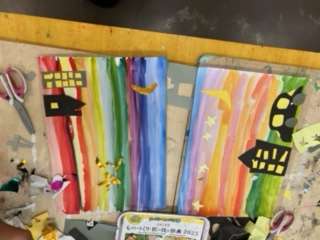 カラフルな色彩をバックに、貼り絵で作品を作り上げていました。