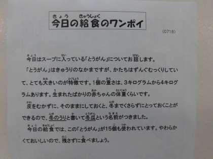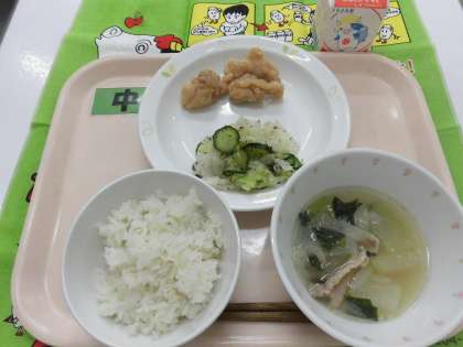 【献立】麦ごはん・とりのから揚げ・ゆかり和え・豚肉と冬瓜のスープ・牛乳