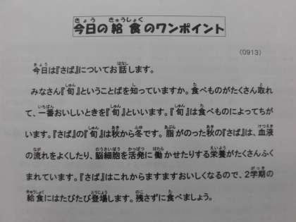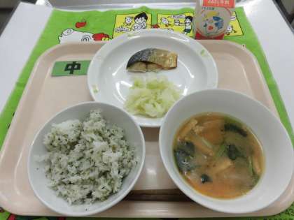 【献立】青のりごはん・鯖の塩焼き・キャベツの甘酢かけ・みそ汁・牛乳
