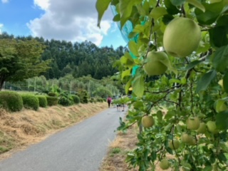 マスつかみの川まで、コスモスの坂を降り、りんごの果樹園を抜け、小さな橋を渡ります。