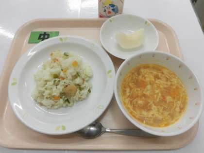 【献立】三色ピラフ・トマトと卵のスープ・梨・牛乳