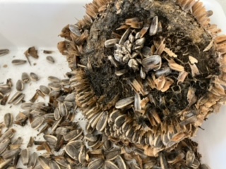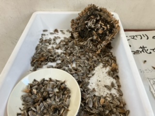 夏の終わり。タネをつけたひまわりが廊下に置いてありました。