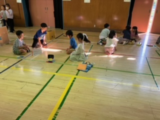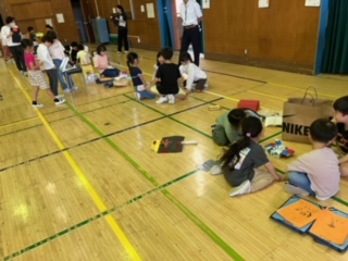 研究授業で、生活科の学習わ体育館で行いました。2年生の子たちが手作りおもちゃで遊ぶお店屋さん。1年生の子たちはお客さんとして存分に楽しんだいました。