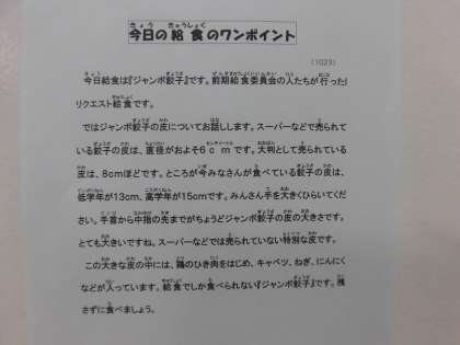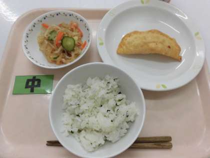 【献立】わかめごはん・ジャンボ餃子・春雨サラダ・牛乳
