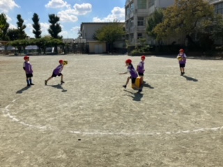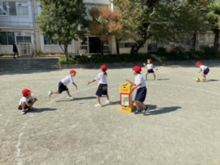 気持ちのよいお天気。校庭では一年生が元気よく的当てを頑張っていました。